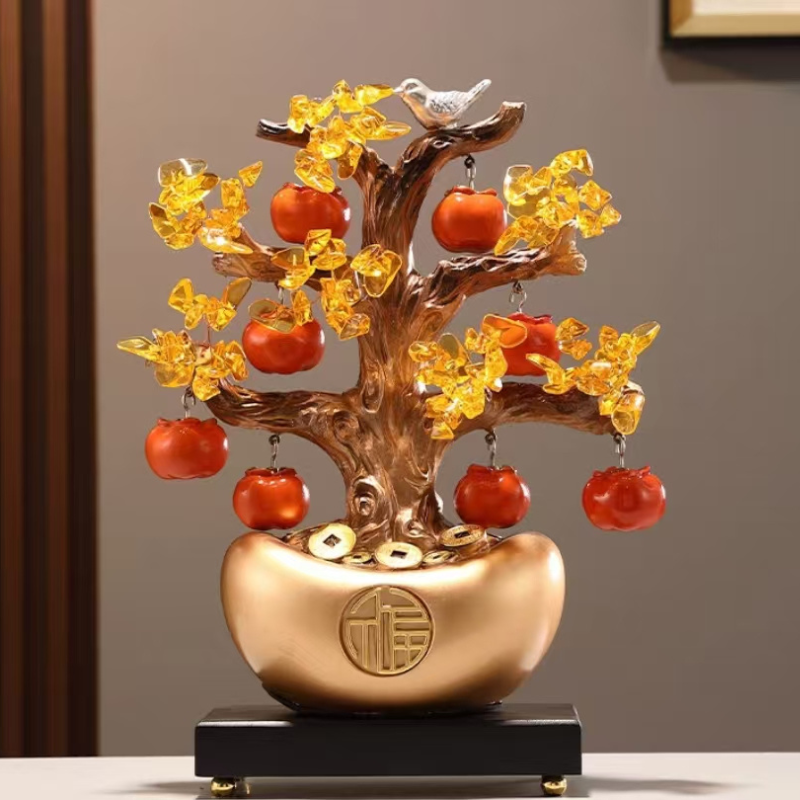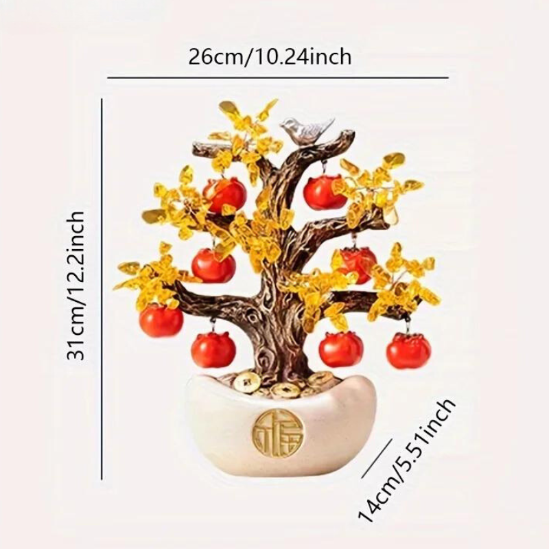 • Elegant Design: A beautifully crafted tree with golden crystal leaves and vibrant red apples, nestled in a sleek base adorned with a traditional Feng Shui symbol.