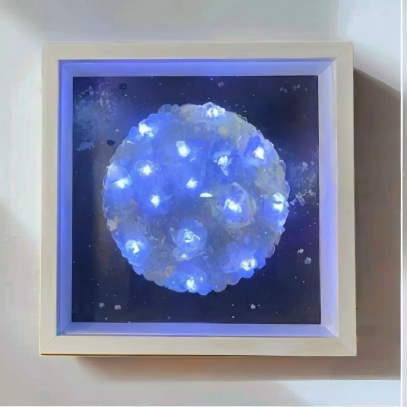 Each Galactic Crystal LED Artwork is a one-of-a-kind creation, hand-selected to showcase the unique beauty of natural Celestite and Opal crystals. The delicate interplay of light and crystal creates a dancing display that is constantly evolving, ensuring that your piece is an exclusive marvel of nature and craftsmanship. Embrace the rarity and distinctiveness of your Galactic Crystal LED Artwork, knowing that it’s a unique treasure bringing both beauty and serenity into your home.